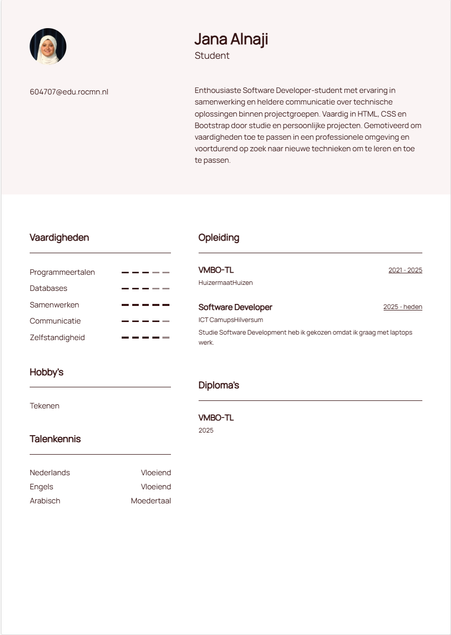 Mijn naam is Jana Alnaji, ik kom uit Palestina en ik studeer Software Development op de ICT-campus. Ik heb voor software development gekozen omdat ik op de middelbare school een paar programeer lessen heb gehad, toen vond ik het programmeren leuk. Later was ik opzoek gegaan naar een opleiding wat hetzelfde aanbod, dus heb ik software development gekozen. Ik wil na mijn opleiding HBO gaan doen of als ik een goede baan heb dat ik dan ga werken. Verder teken ik in mijn vrije tijd en als ik iets heb gezien wat me heeft geïnspireerd.